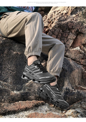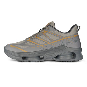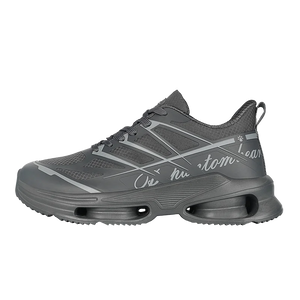 A thick, sculpted midsole (in matching grey) combined with treaded outsole patterns suggests solid grip and shock absorption—ideal for rough terrain or slippery surfaces.