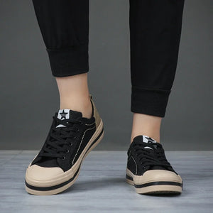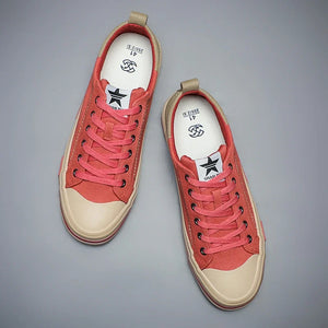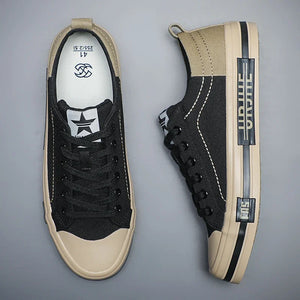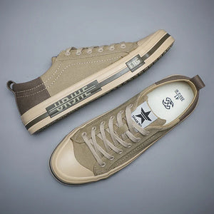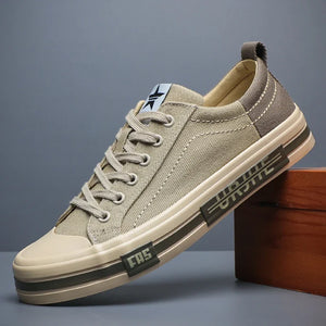 Step up your casual footwear game with these urban-inspired canvas sneakers. Featuring a durable olive green canvas upper and stylish khaki accents, these shoes blend classic design with modern streetwear flair. The chunky rubber sole is detailed with unique, raised block lettering, adding a contemporary edge to the timeless low-top silhouette. Complete with a protective rubber toe cap, contrast stitching, and a comfortable fit, these sneakers are perfect for everyday wear, pairing effortlessly with jeans, joggers, or shorts.