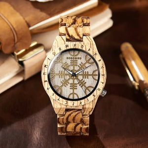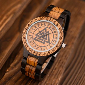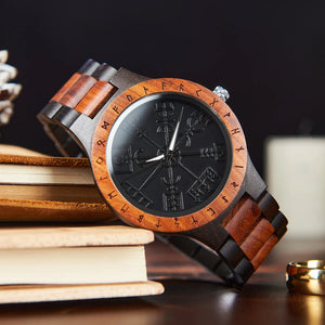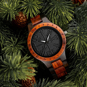Bring ancient mystique to modern style with this Nordic Rune Wooden Watch. Rich two-tone wood frames a textured black dial etched with a compass-like Nordic motif and encircled by carved runes — a striking fusion of nature and legend. Lightweight and comfortable for daily wear, the precise quartz movement keeps you on time while the one-of-a-kind wood grain makes every watch unique. Perfect as a standout gift or a signature accessory for the adventurous at heart.